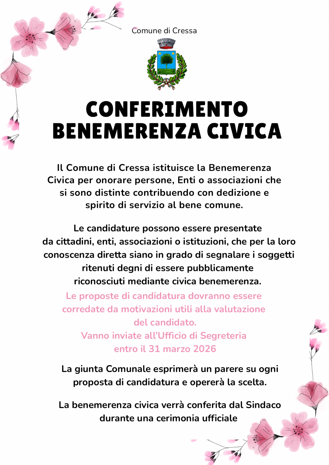 Le candidature, corredate da una breve relazione che ne esponga le motivazioni, possono essere presentate da privati cittadini, enti o Associazioni che siano in grado di segnalare soggetti che si siano distinti, e pertanto ritenuti degni di essere pubblicamente riconosciuti mediante il conferimento della benemerenza civica, e devono pervenire all'Ufficio di Segreteria - segreteria@comune.cressa.no.it entro il termine del 31 Marzo 2026.