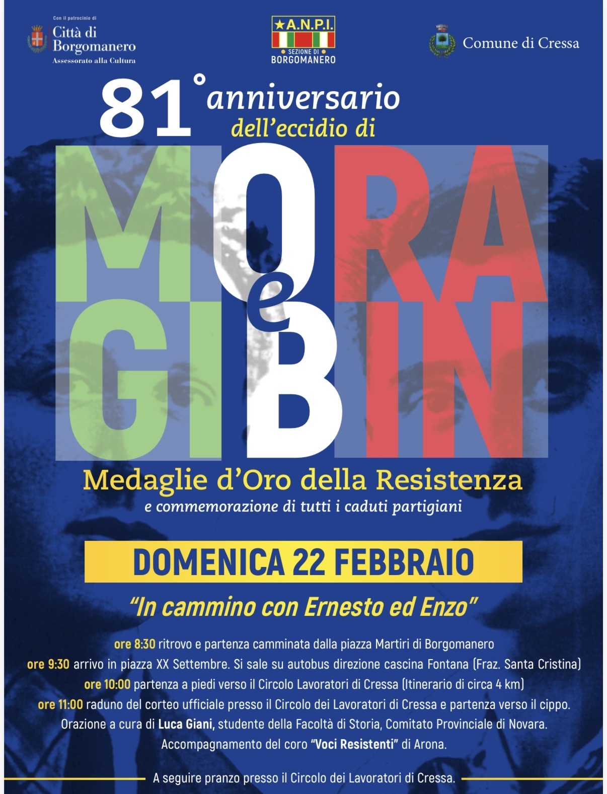 La Sezione ANPI di Borgomanero organizza, in collaborazione con il Comune di Borgomanero e il Comune di Cressa, la Cerimonia Commemorativa in ricordo delle M.O. della Resistenza Mora e Gibin, in occasione dell' 81° Anniversario del Loro Sacrificio, nella giornata di Domenica 22 Febbraio 2026.