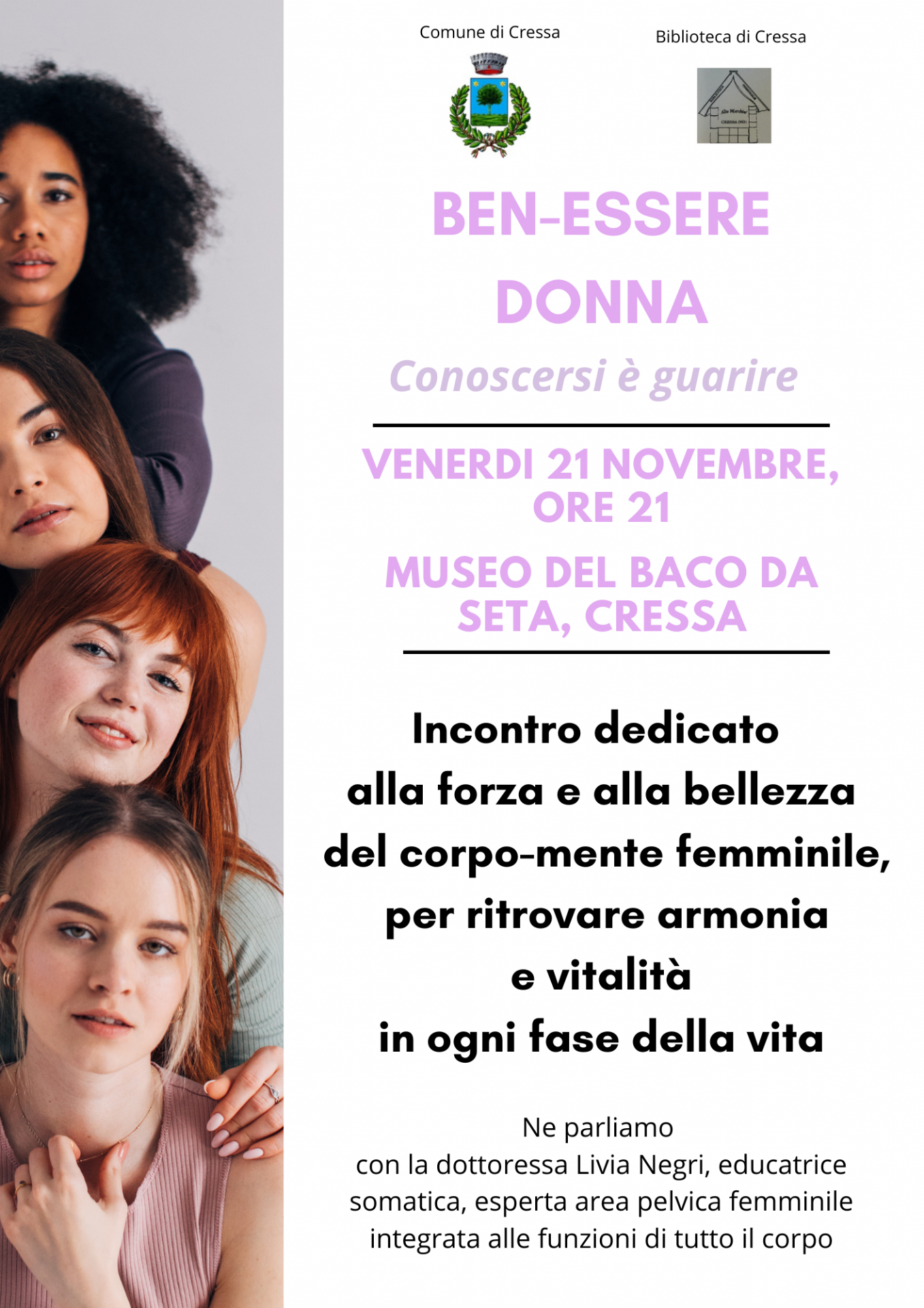 L'Amministrazione Comunale, in collaborazione con la Biblioteca Civica "Aldo Marchini" organizza per Venerdì 21 Novembre, presso il Museo del Baco da Seta, alle ore 21.00, un incontro dal titolo: " BEN-ESSERE DONNA " Conoscersi è guarire.