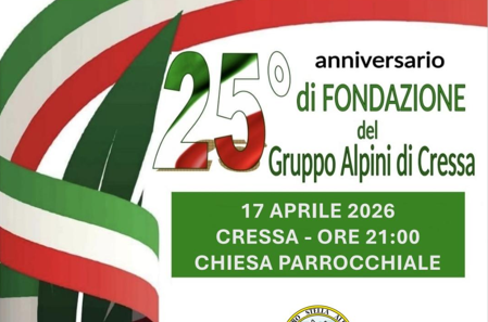 Il Gruppo Alpini di Cressa, nell'ambito dei Festeggiamenti e delle cerimonie per il 25° Anniversario della Fondazione invita la Cittadinanza al concerto dei due Cori Alpini: