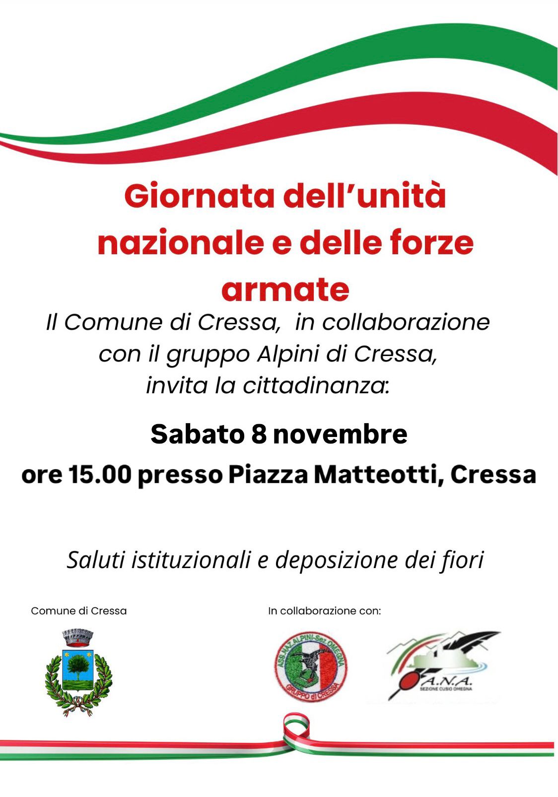 Il Sindaco e l'Amministrazione Comunale, invitano le Assocazioni di Cressa e tutta la Cittadinanza a partecipare alla Cerimonia in programma per Sabato 8 Novembre alle ore 15.00 presso la Piazza Matteotti, organizzata con la collaborazione del Gruppo Alpini di Cressa.