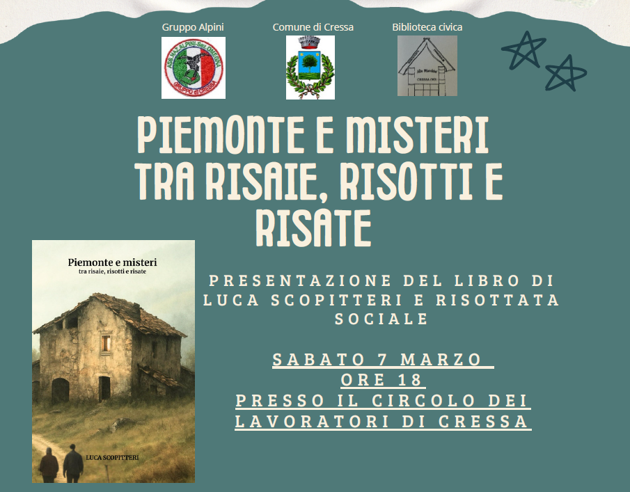 La Biblioteca Comunale di Cressa presenta il Libro di Luca Scopitteri dal titolo: "Piemonte e Misteri tra risaie, risotti e risate" Sabato 7 Marzo 2026 presso la Sala del Circolo dei Lavoratori alle ore 18.00.
