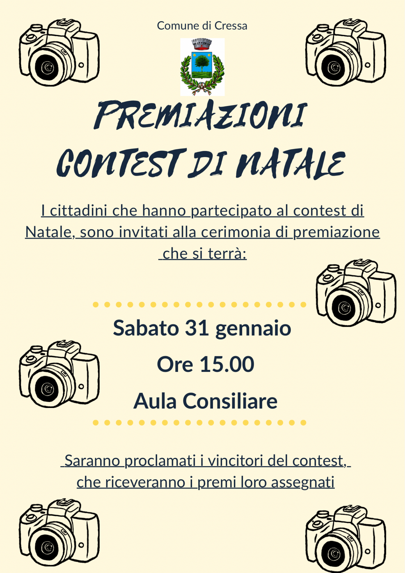 L'Amministrazione Comunale invita tutti i Cittadini che hanno partecipato al Concorso Fotografico "Scatta...Sorridi è Natale" alla cerimonia di premiazione, che si terrà presso la sala consiliare Sabato 31 Gennaio 2026 alle ore 15.00.